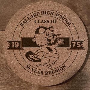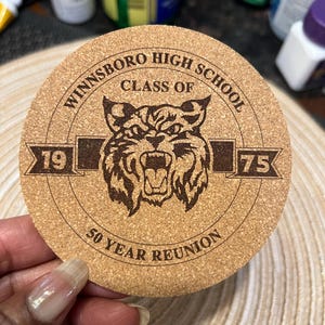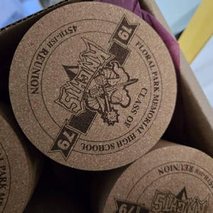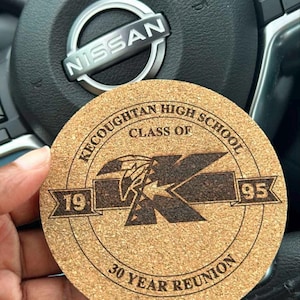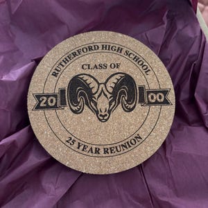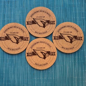 Are you planning a high school class reunion or graduation party and looking for a personalized take-home keepsake for attendees? These custom engraved, class reunion cork coasters are the perfect party favor that will remind your graduating class of past school days! Have your school mascot engraved on these natural, real cork coasters as a special gift to your graduating class. These coasters also make great event table decor, so they can be used at the reunion and/or taken home as a gift.